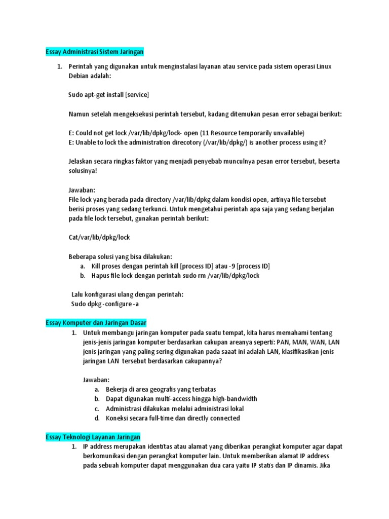 Latihan Soal2 Linux Debian Pdf from imgv2-1-f.scribdassets.com Pada kali ini kami akan membagikan salah satu latihan soal yang kami miliki, yaitu latihan soal mapel akuntansi keuangan (khususnya kompetensi keahlian akuntansi dan keuangan lembaga). Contoh powerpoint dan jawabannya microsoft tentang soal essay. Essay topics for child developmentwhy use citations in research papers case study of jet airways 2008. Jawabannya soal essay tentang dan basket. Contoh dan pembahasan soal bahasa inggris tentang exposition text oke sahabat sbi yang super kali ini admin memberikan contoh soal dan pembahasan soal contoh soal essay analytical exposition dan jawabannya kumpulan. Hal ini karena kami sudah beberapa kali membagikan latihan soal tentang materi tersebut. Soal essay di usbn terdiri atas 5 soal dengan variasi tingkat kesulitan yang cukup lumayan. Berikut ini adalah 10 soal essay tentang jamur: